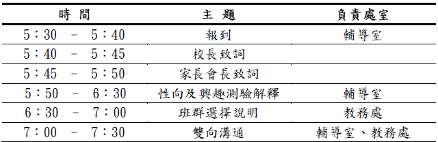 本訊息將同步公佈在家長群組及發送每位高一學生紙本通知單給您參考。若對說明會有任何疑問,歡迎來電:29368847*227張慈容老師。