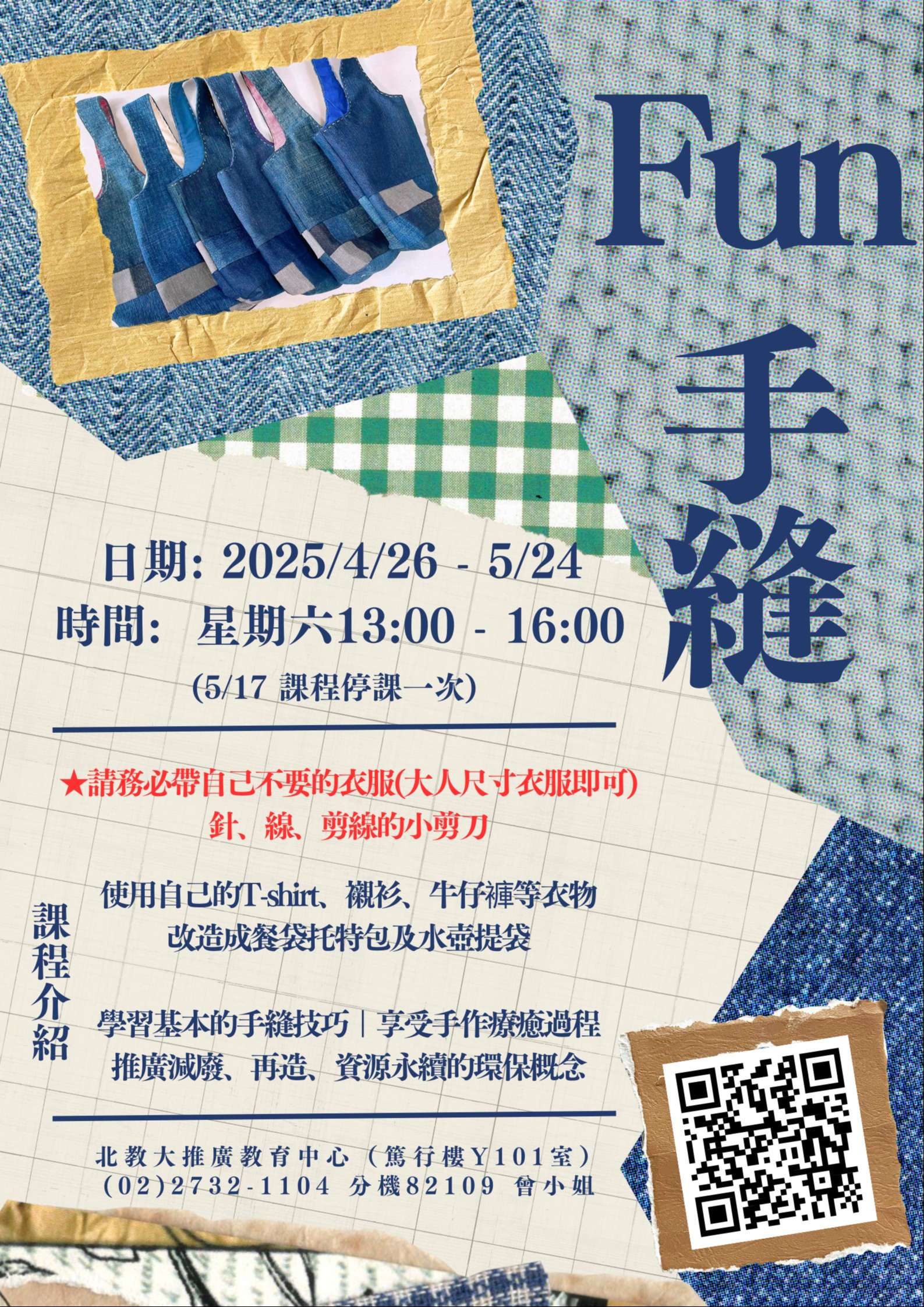 一、本校推廣教育中心辦理為期四週的生活藝術系列課程,即 日起開放報名,課程資訊如下:生活藝術系列—Fun手縫 (HandMay五月場)
