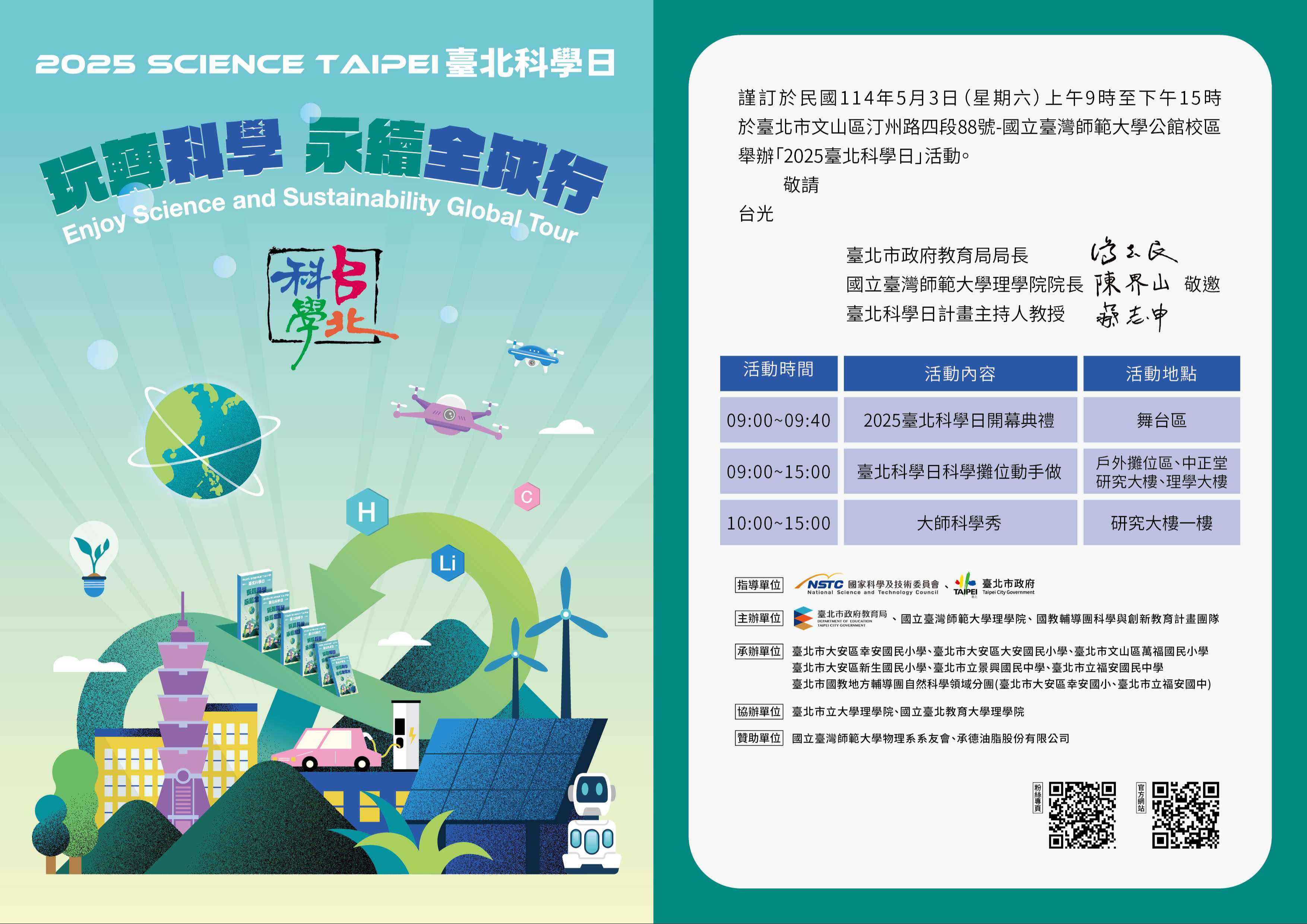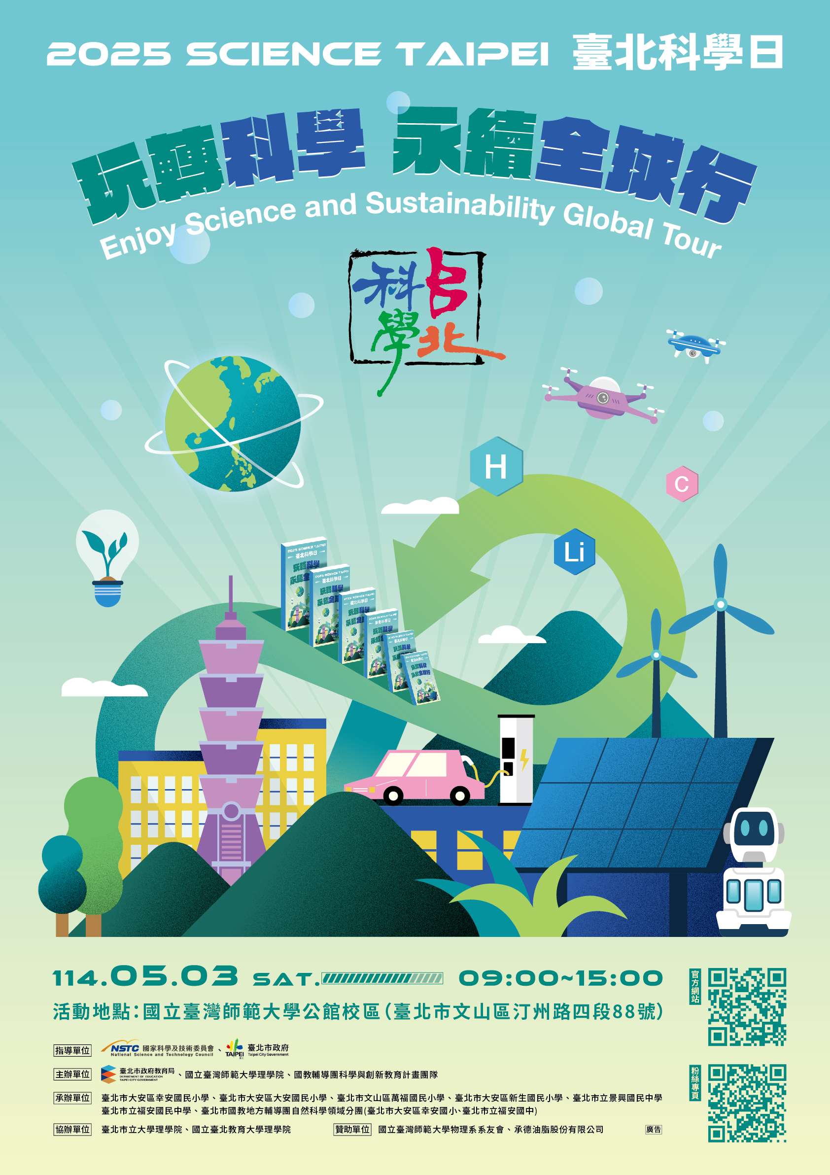 二、旨案係由本局與國立臺灣師範大學理學院物理學系合作舉 辦,本年度將於114年5月3日(星期六)假師大公館校區辦 理科學體驗實作活動,並響應聯合國教育科學及文化組織 「永續發展國際十年(IDSSD)」理念,藉本活動「玩轉科 學-永續全球行」之主題,彰顯本市對於推動科學教育的重 視。
