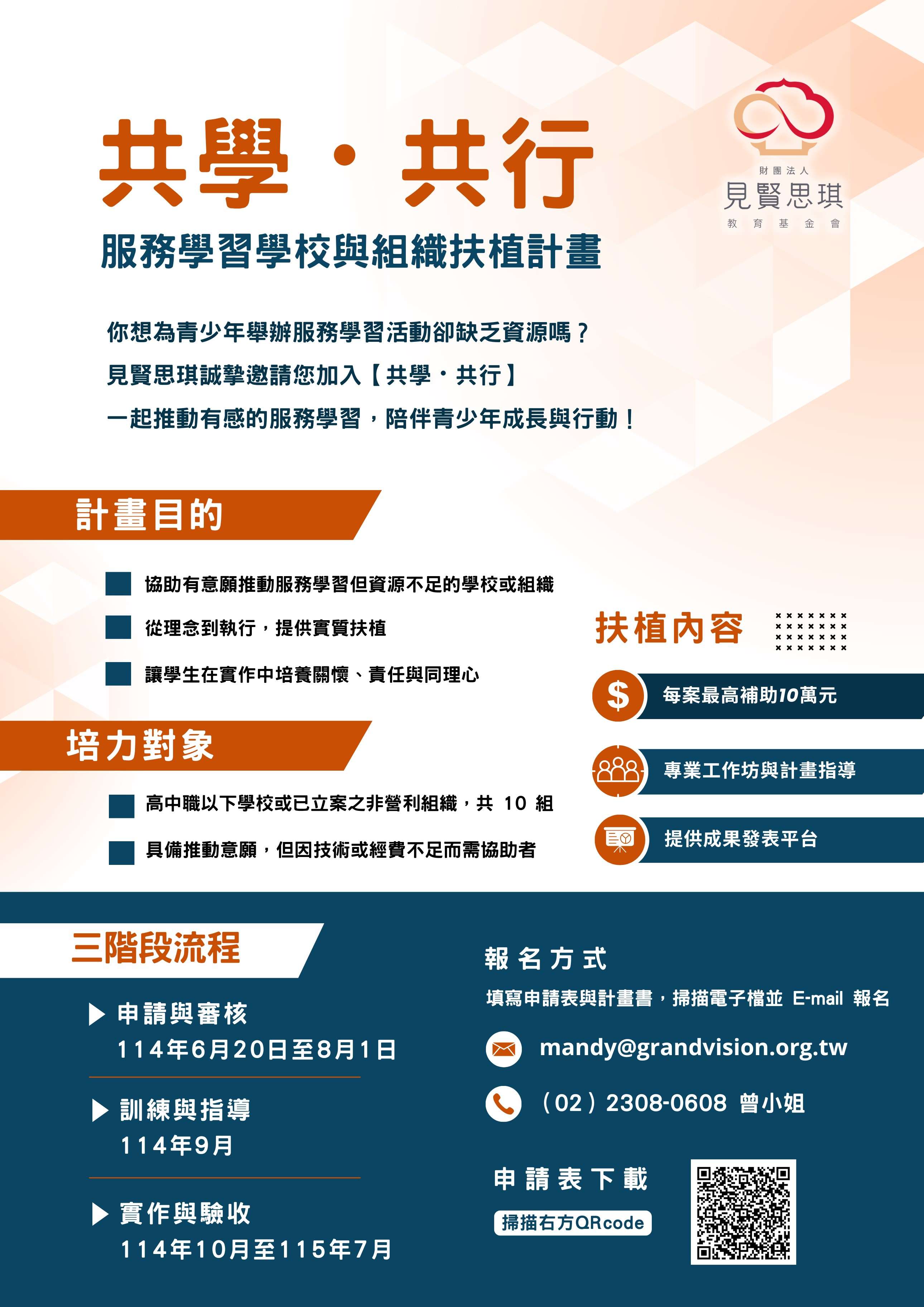 二、計畫提供實務技術與經費支持,協助10個學校及非營利組 織推動服務學習,並強化其課程規劃與執行能力。