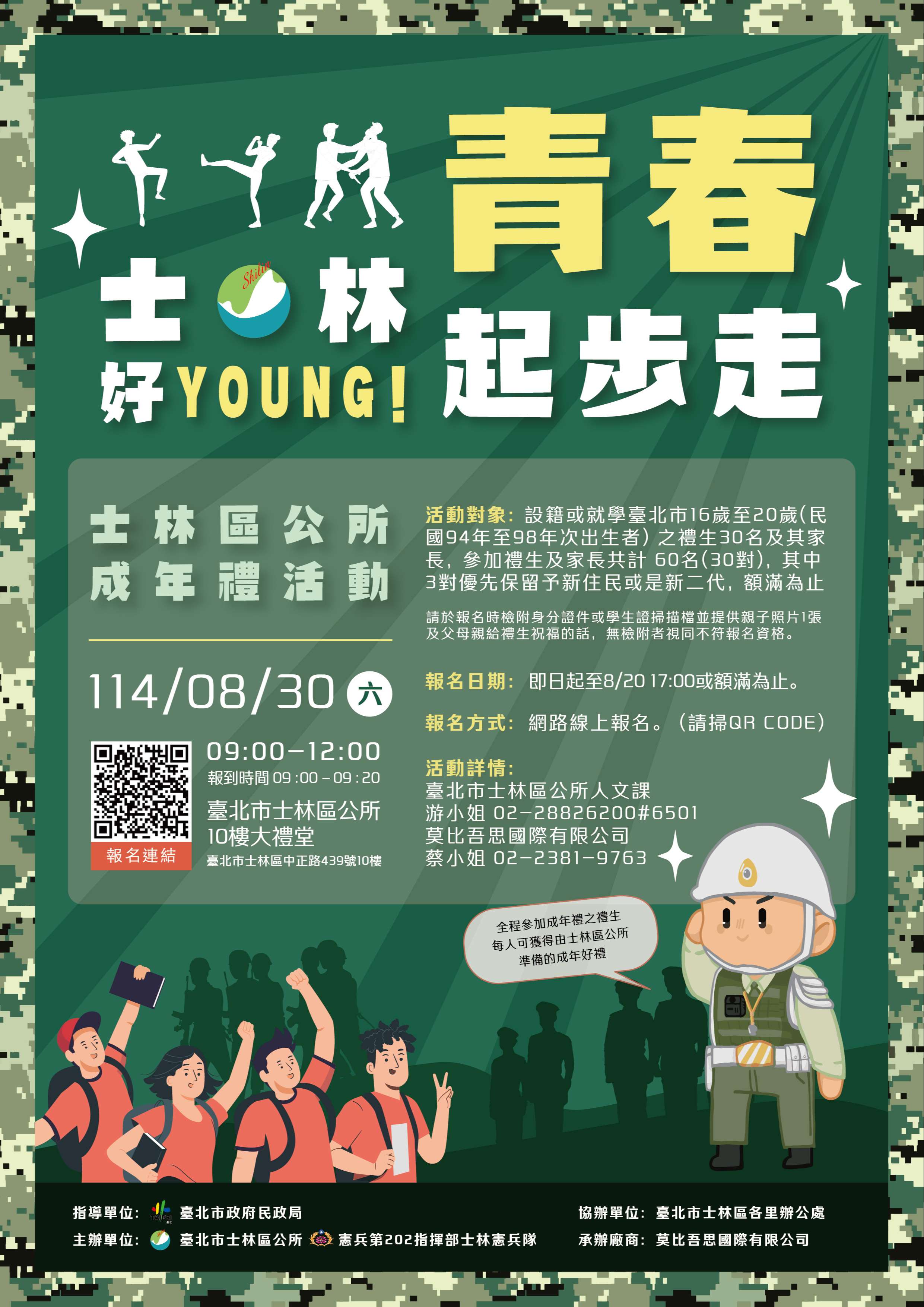 一、旨揭活動訂於114年8月30日(六)上午9時在本所10樓大禮 堂辦理本區114年度「士林好YOUNG 青春起步走」成年禮活 動,全程參加者可獲得精美禮品,詳細活動內容請參考報 名簡章,相關問題請洽臺北市士林區公所28826200轉6501 游小姐。