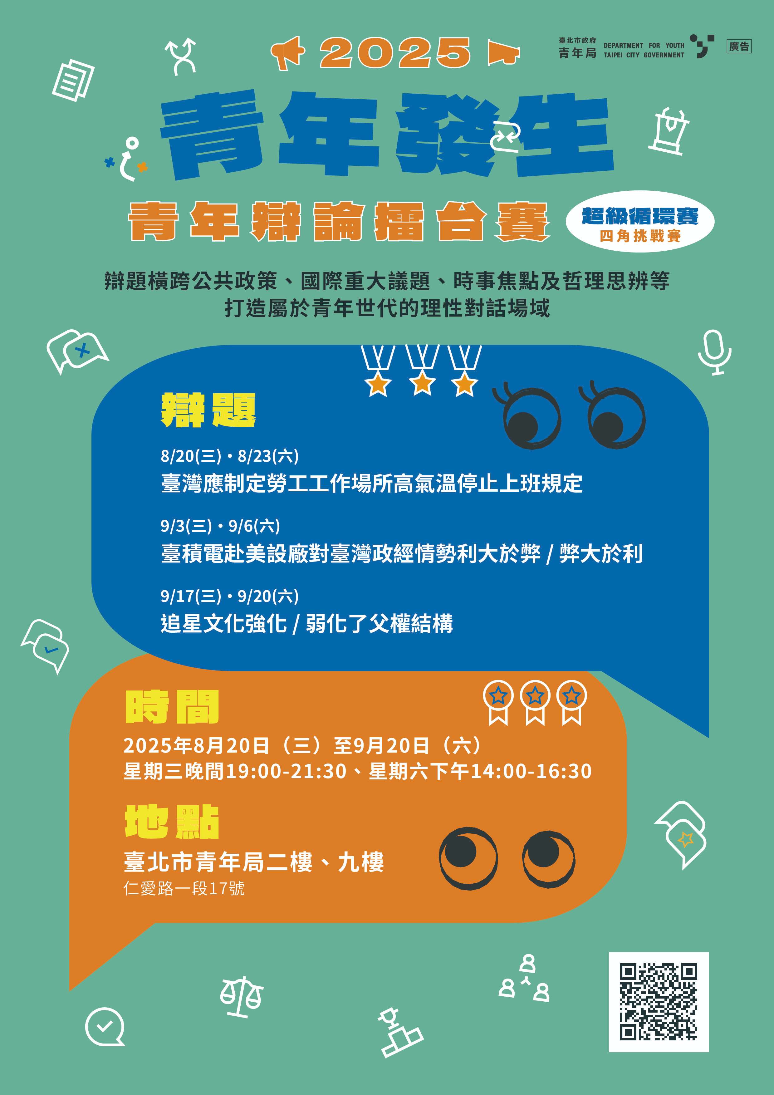 2、台積電赴美設廠對臺灣政經情勢利大於弊/弊大於利 (1)9月3日(星期三)19:00-21:30 (2)9月6日(星期六)14:00-16:30 3、追星文化強化/弱化了父權結構 (1)9月17日(星期三)19:00-21:30 (2)9月20日(星期六)14:00-16:30 (二)活動地點:臺北市政府青年局(臺北市中正區仁愛路一 段17號)。