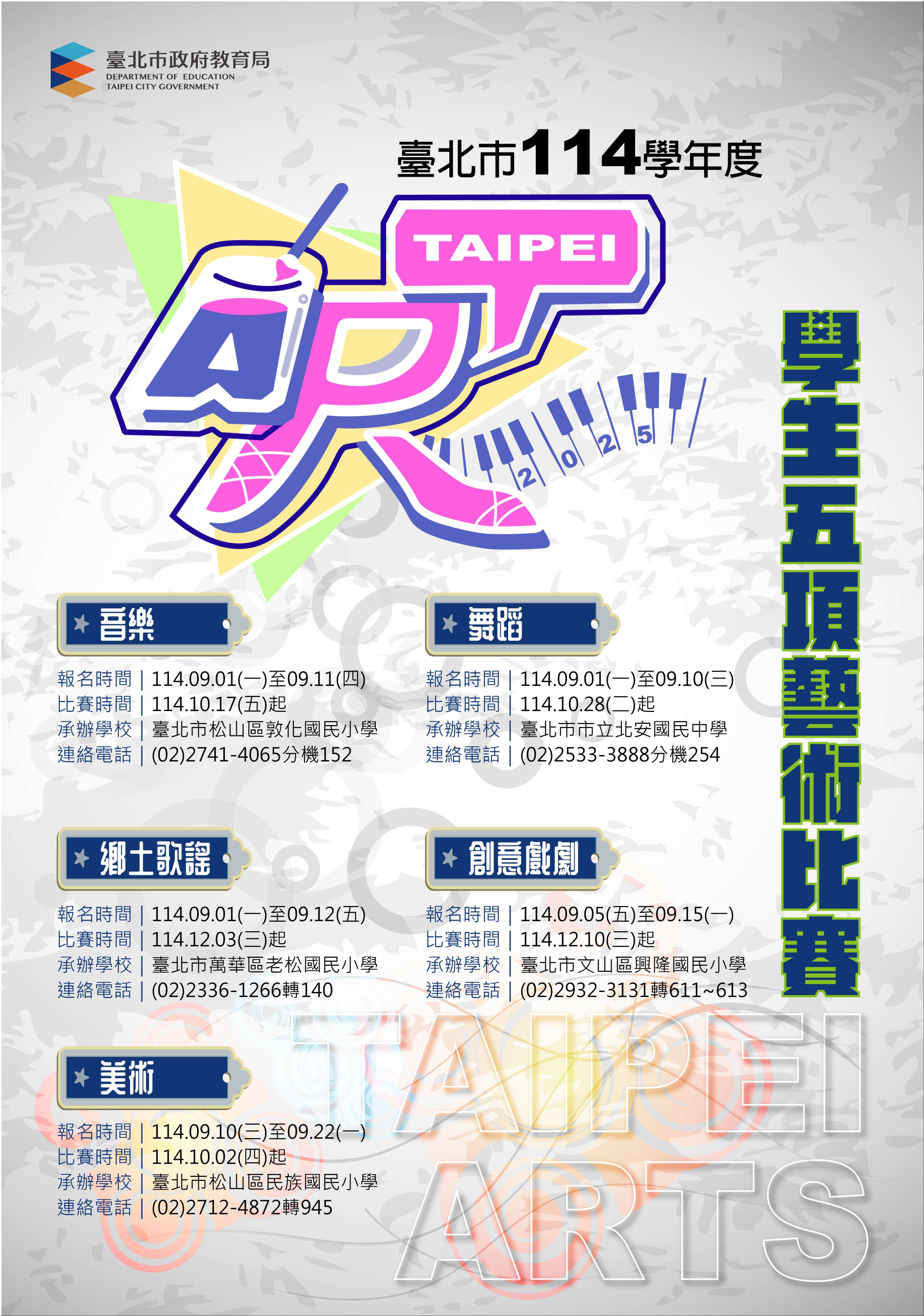 六、檢附本市114學年度學生五項藝術比賽時程表1份及海報2 份,請協助列印公告周知。實施計畫電子檔可至本市五項 藝術比賽網站(網址:https://www.tpcityart.tp.edu.tw /Home/ NewContent/484)下載。