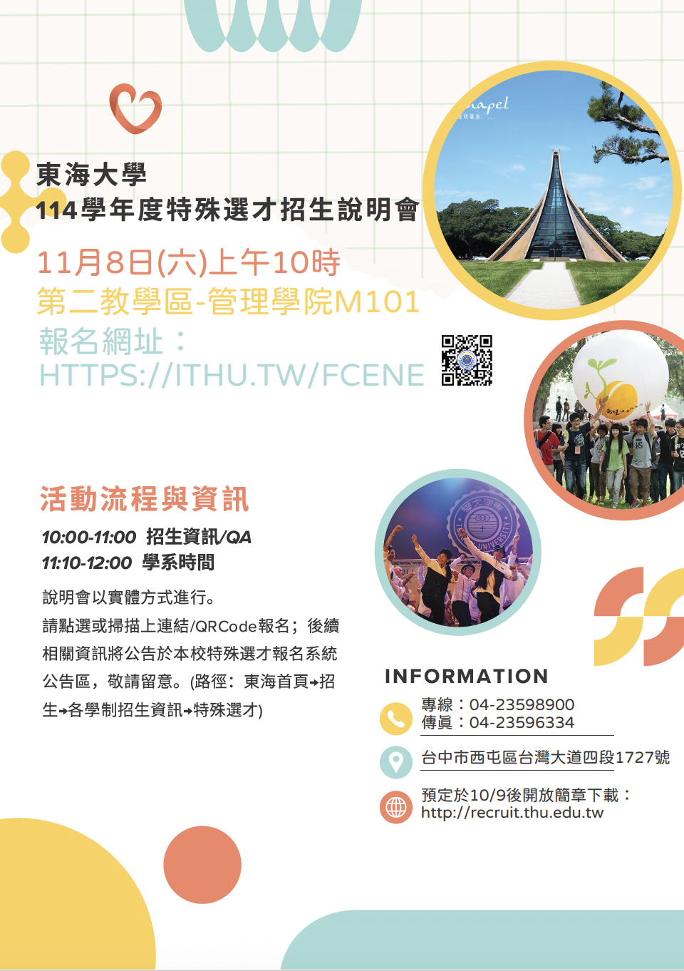 一、教育部核定本校115學年度特殊選才招生名額共計63名,招生簡章預定於本(114)年10月9日(星期四)公告於本校網頁(http://recruit.thu.edu.tw)。