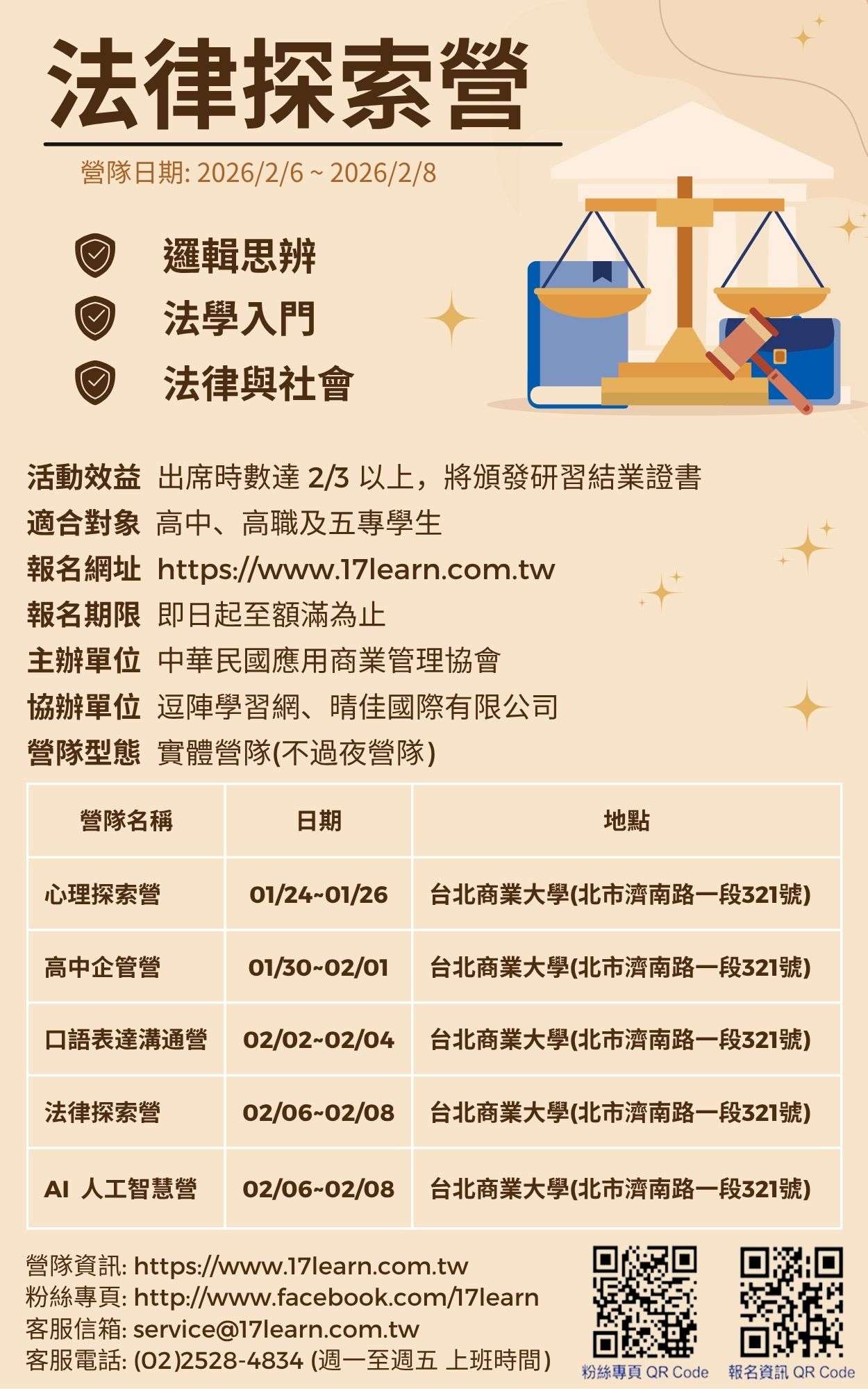 許多人覺得法律高深難懂,但其實生活中處處離不開法 律,【法律探索營】將透過專業的法律課程、遊戲偵查推 理、模擬法庭等多元活動,拉近學生與「法」的距離!