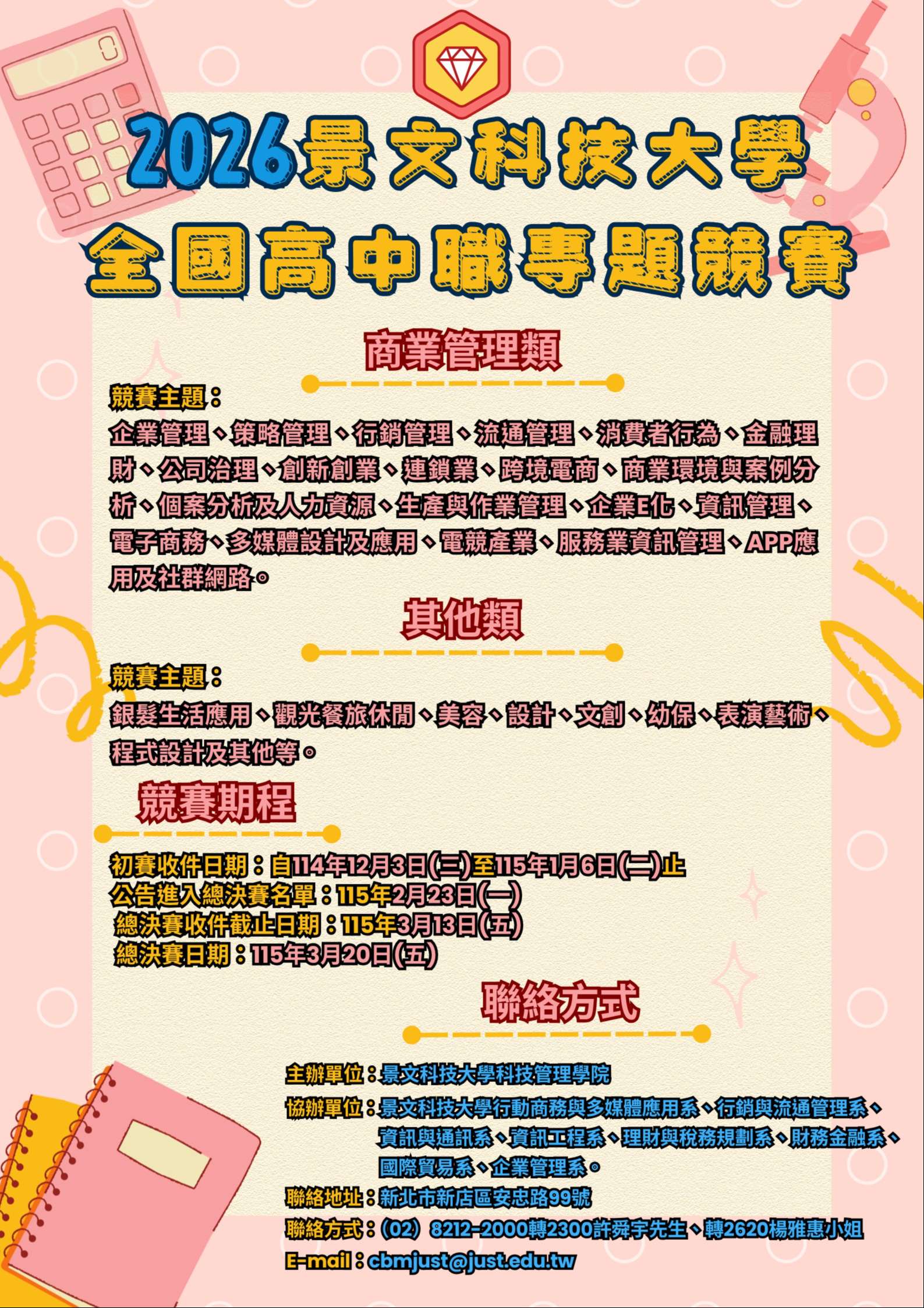 一、活動方式與報名方式、參賽相關資料詳如附件(景文科技大 學2026全國高中職專題競賽活動計畫書)及報名網站 (https://cbm.just.edu.tw/cbm2026/Menu/Poster. aspx)。