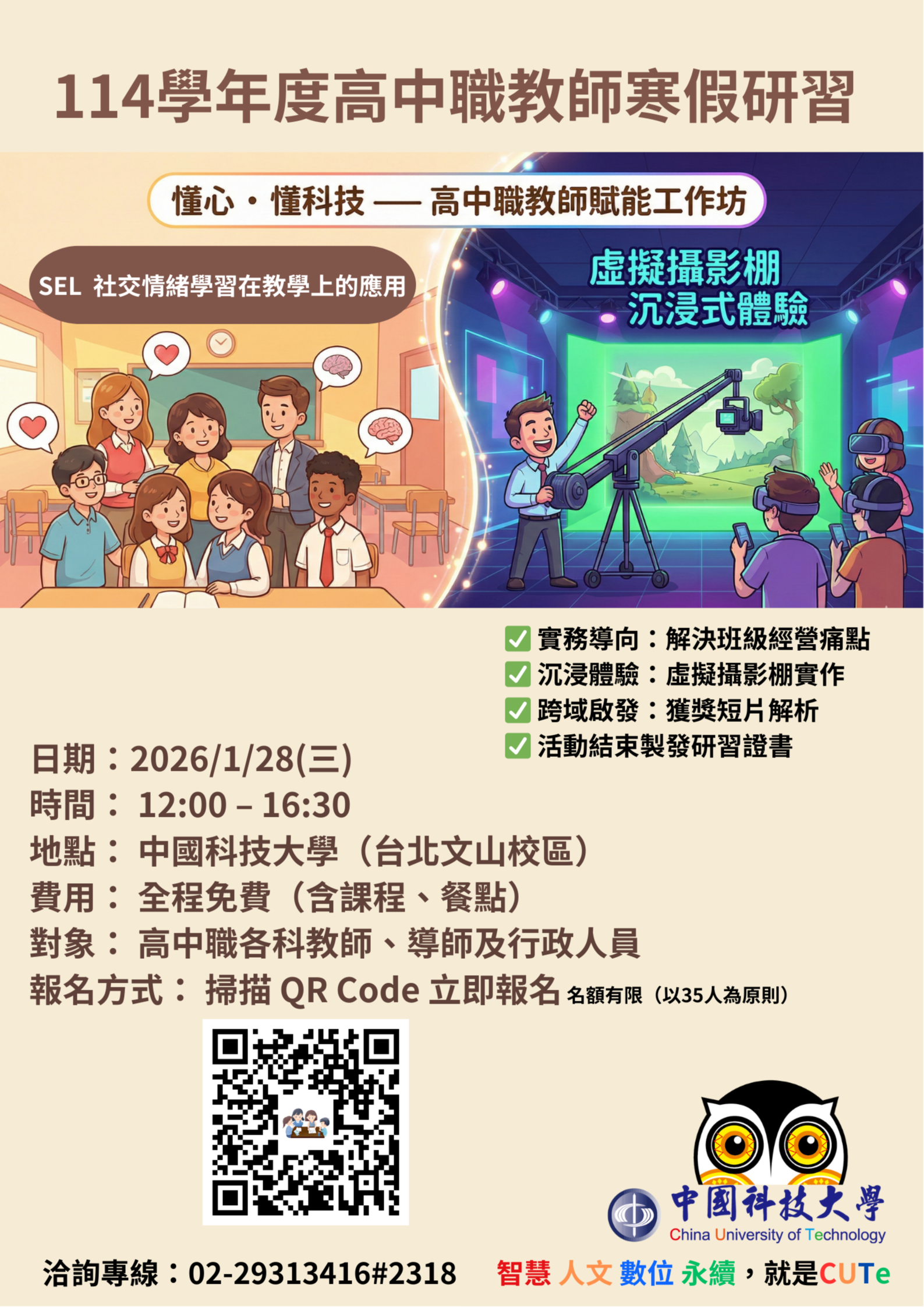 二、研習日期時間為115年1月28日12:00–16:30(含午餐交 流、講座、實作體驗及座談),地點為本校臺北文山校 區。全程免費,並提供研習證書。