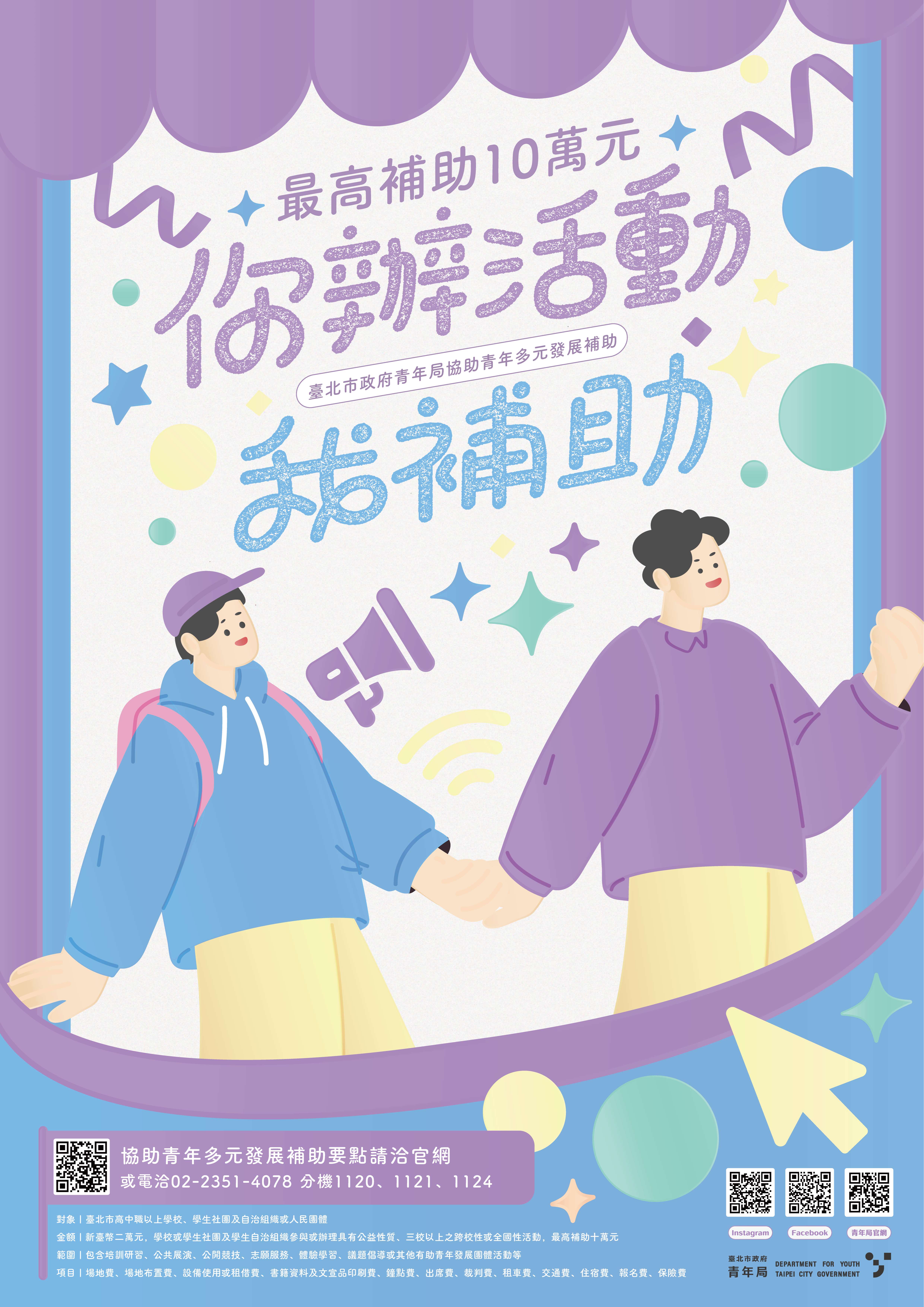 (三)詳細資訊及申請方式請至本局機關網站(網址:https://youth.gov.taipei/)「各項服務」-「補助貸款」-「臺北市政府青年局協助青年多元發展補助要點」查詢利用。