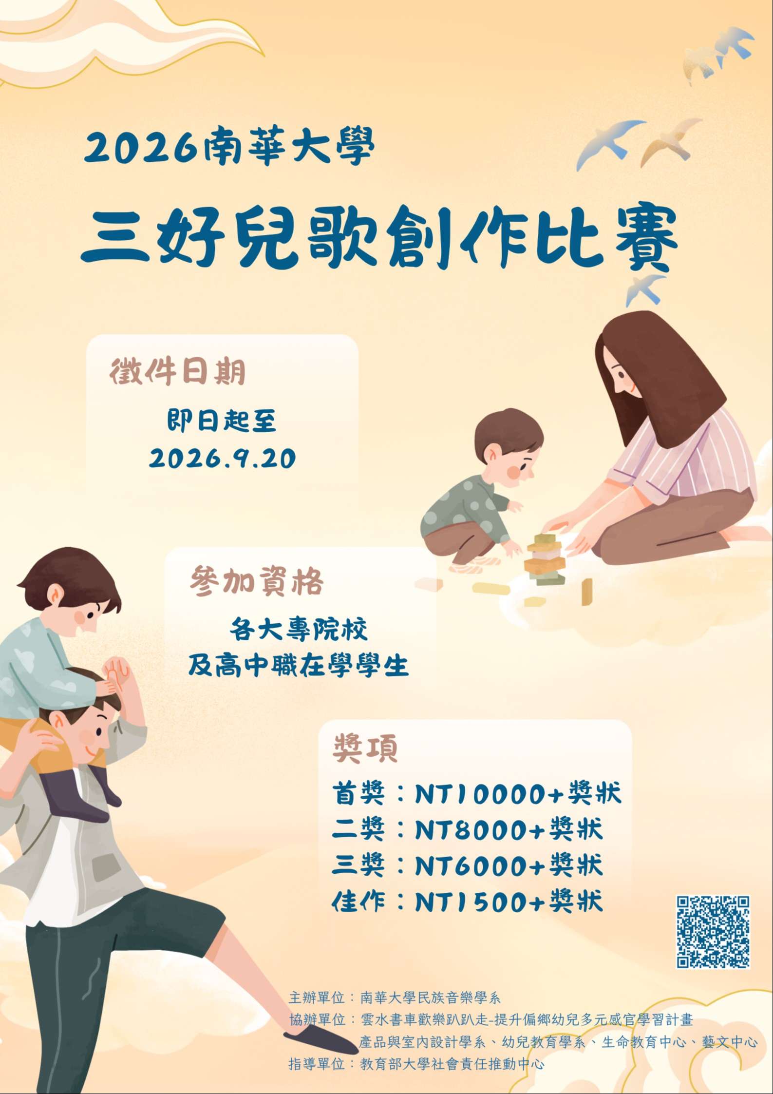 三、活動相關辦法請見「三好兒歌創作大賽」官網活動頁面 https://sites.google.com/nhu.edu.tw/child-songs? usp=sharing。