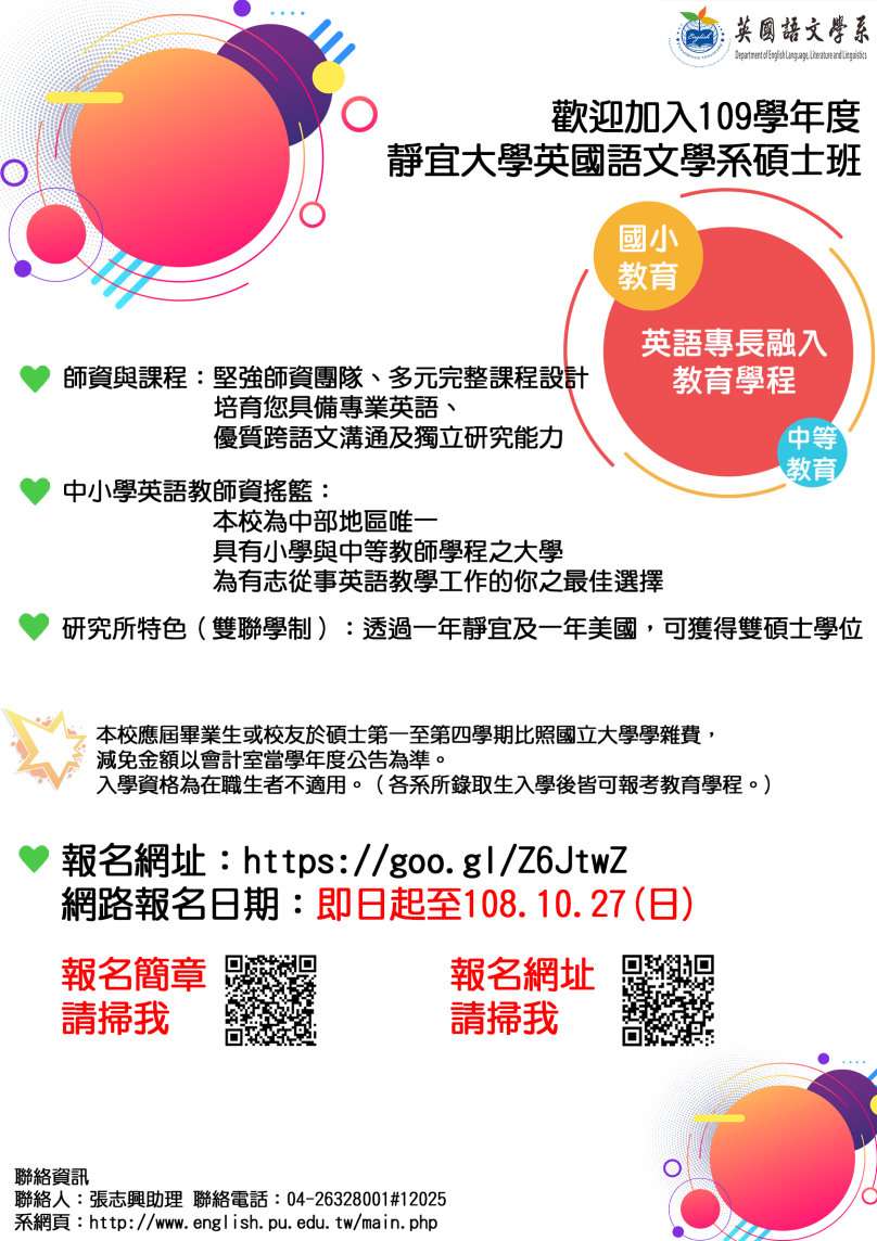 一、靜宜大學英國語文學系109學年度碩士班甄試入學招收一般生和在職生共5名。