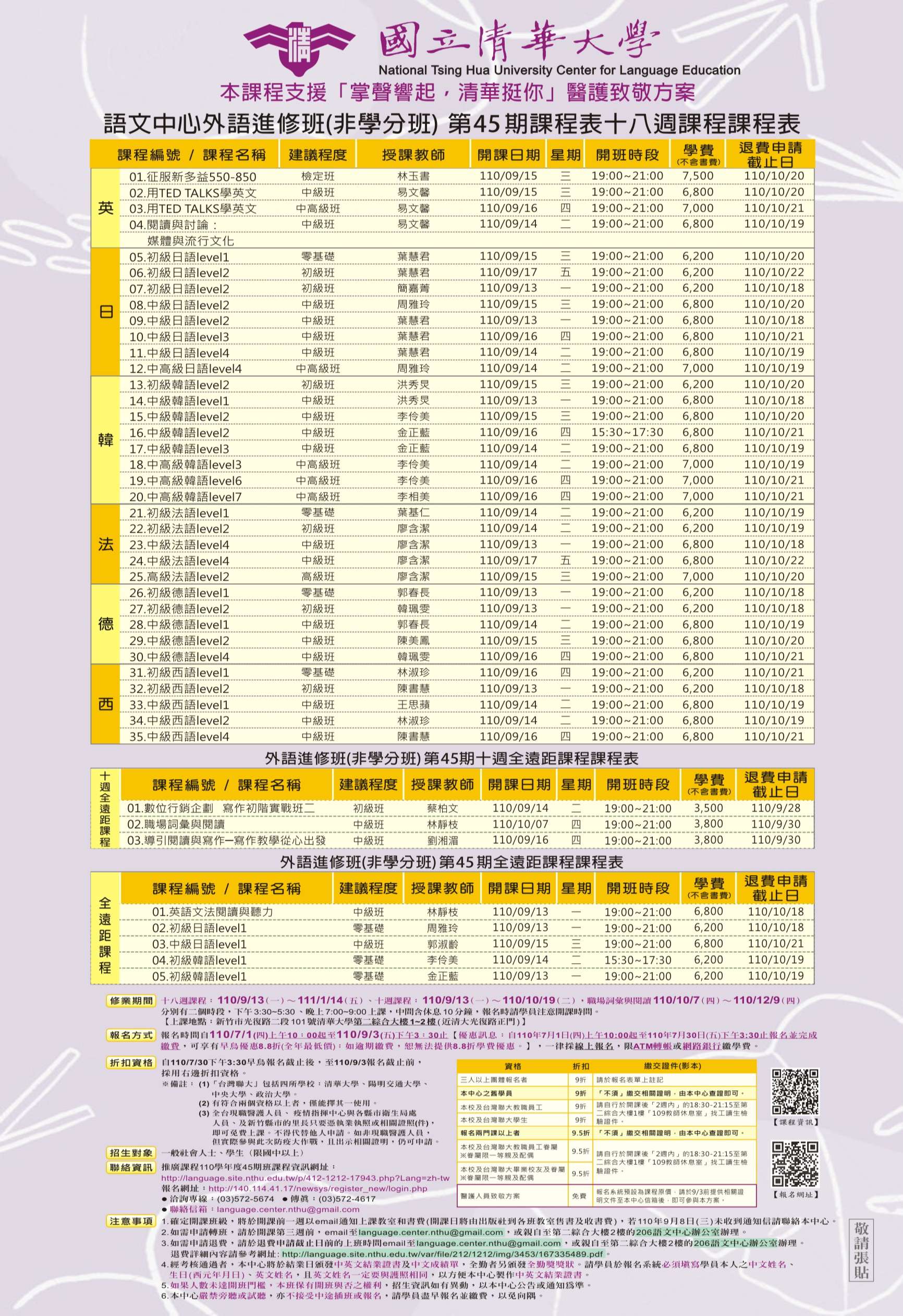 一、為嘉惠民眾終身學習並落實大學社會責任,本校語文中心為培育國際溝通力,辦理各類語文課程。第45期外語推廣課程內容包涵英、日、韓、法、德、及西等六國語言,各類課程資訊請詳見:http://language.site.nthu.edu.tw/p/412-1212-18336.php?Lang=zh-tw。