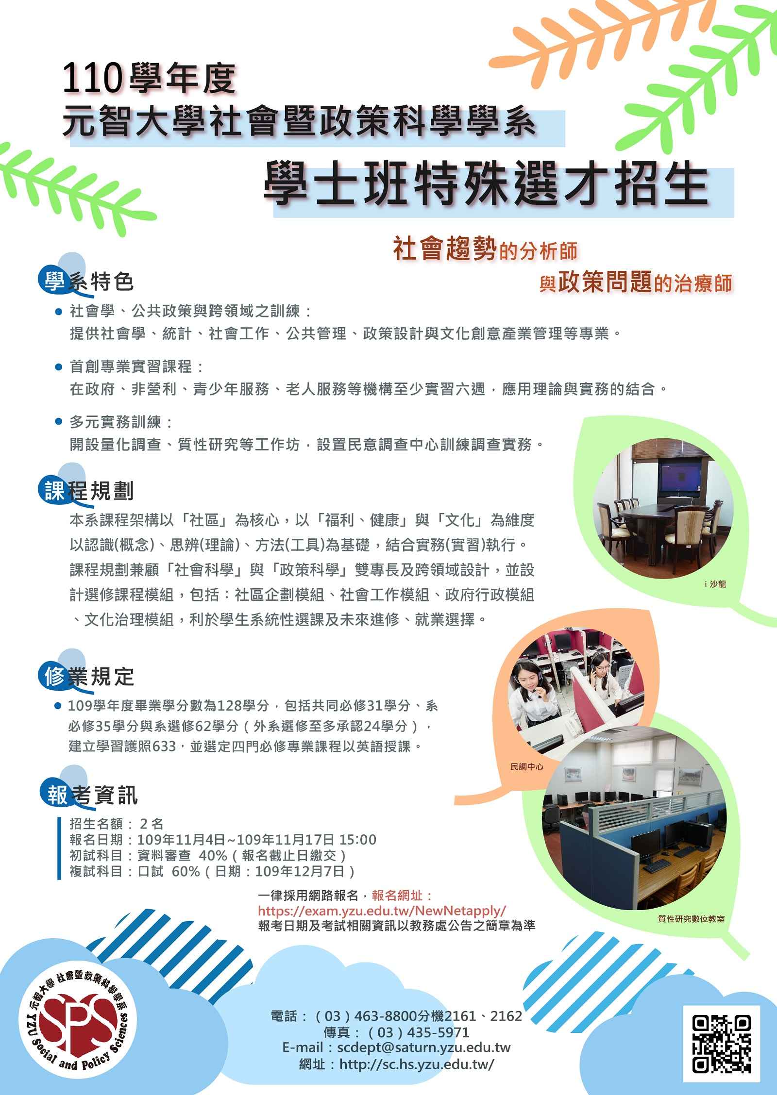 主旨: 檢送本校社會暨政策科學學系110學年度學士班特殊選才 招生文宣,招生資訊網址:http://www.yzu.edu.tw /admissions/