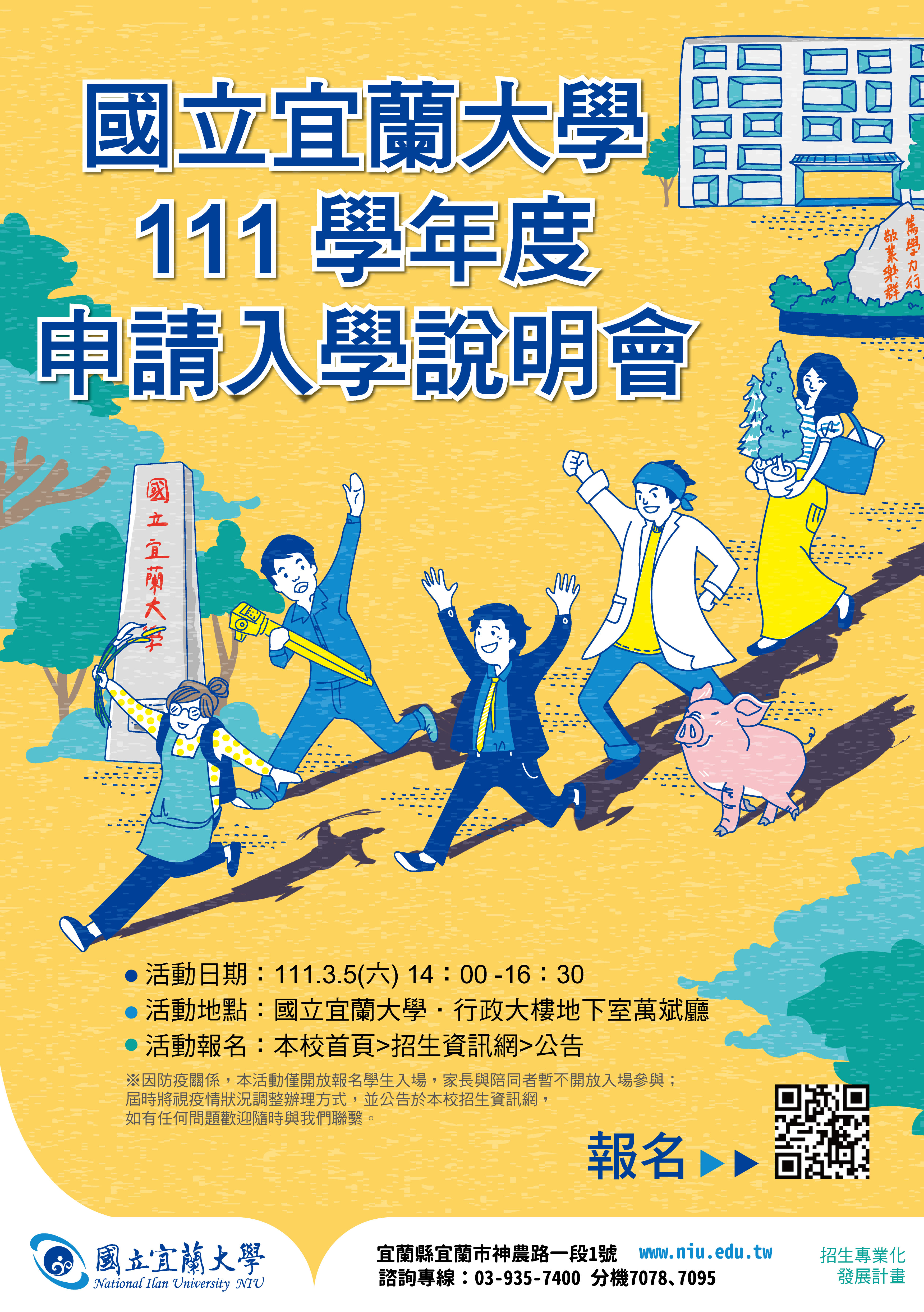 一、為增進考生了解申請本校各學系學習歷程檔案審查重點及準備方向,本校訂於111年3月5日(六)下午2點於本校萬斌廳辦理「111學年度大學申請入學招生說明會」,並邀請各招生學系於當日就審查重點及準備指引、學系特色、選才理念、希望招收的學生特質(多元能力)、審查的角度、學習歷程與學系專業領域的相關性、未來學習方向等向考生說明介紹,相關報名資訊請參閱報名網址,歡迎考生踴躍報名參與。