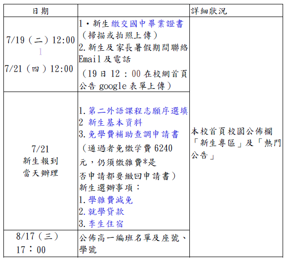 四、新生實體到校日期預告: