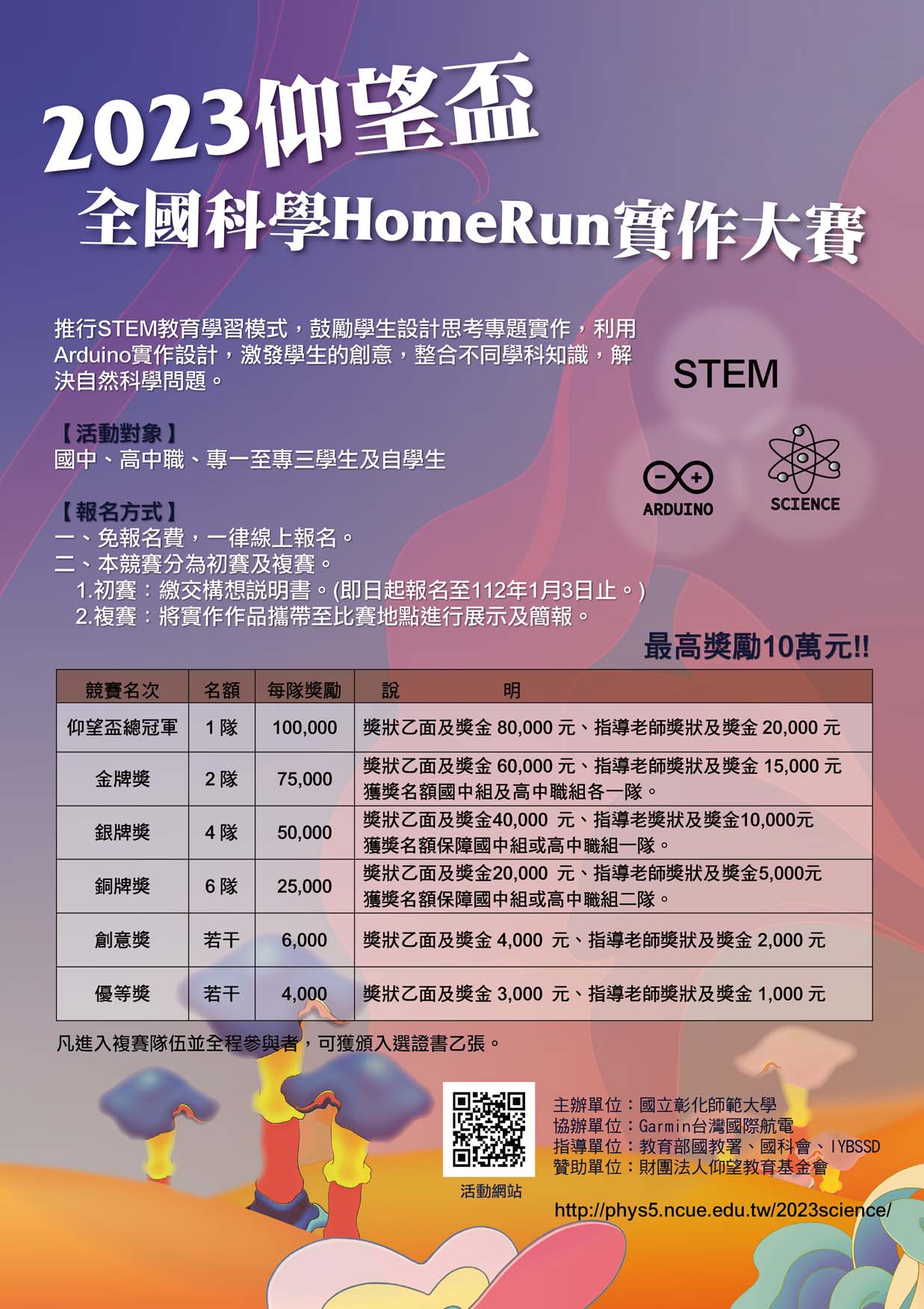 一、本校與財團法人仰望教育基金會合作,為推行STEM教育, 利用Arduino實作設計解決自然科學問題,共同辦理「2023 仰望盃全國科學HomeRun實作大賽」,活動謹訂於111年5月 6日(星期六),假國立彰化師範大學舉辦。
