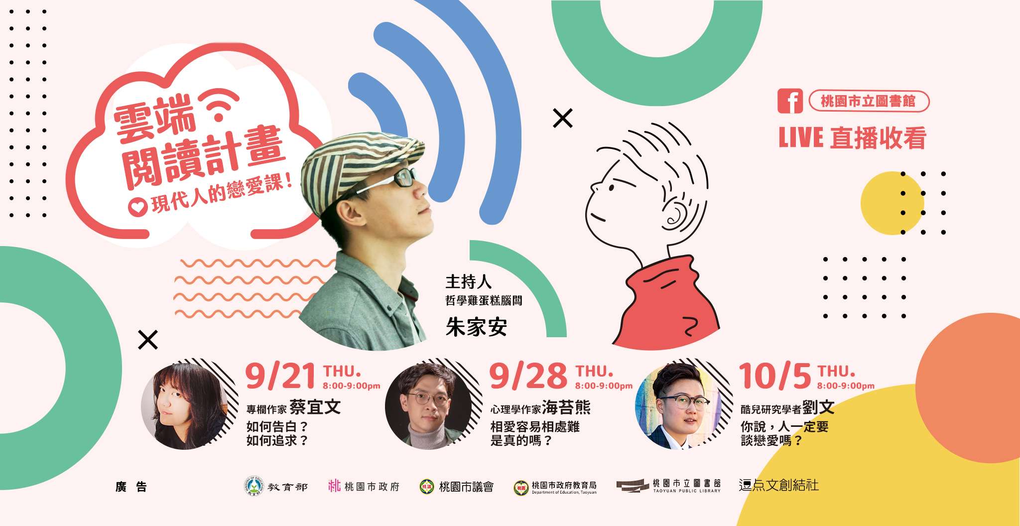 一、本講座透過本館(桃園市立圖書館)臉書粉絲專頁直播,適合成人與高中生參與,將由主持人朱家安,以及知名學者、文化評論者、心 理學作家一同分享,帶領大家走進有趣的哲學生活、打好在網路與實際生活中與他人良好溝通的基礎