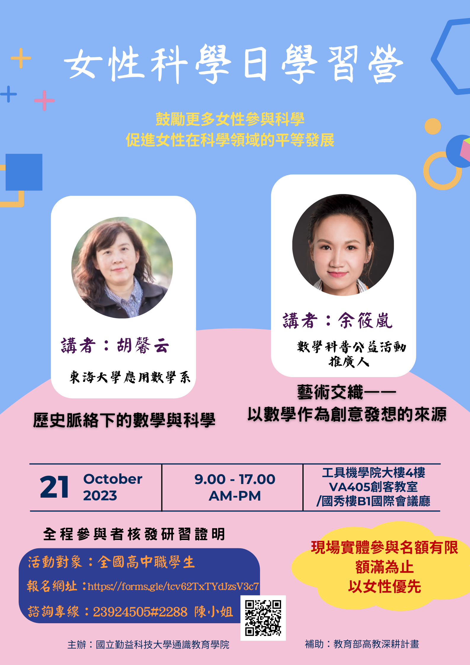 (一)目的:為鼓勵更多女性參與科學,促進女性在科學領域 的平等發展,特舉辦女性科學日學習營。