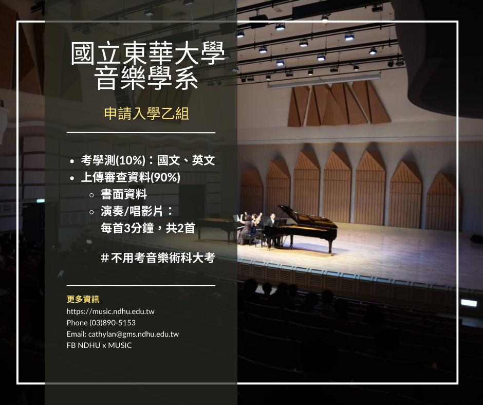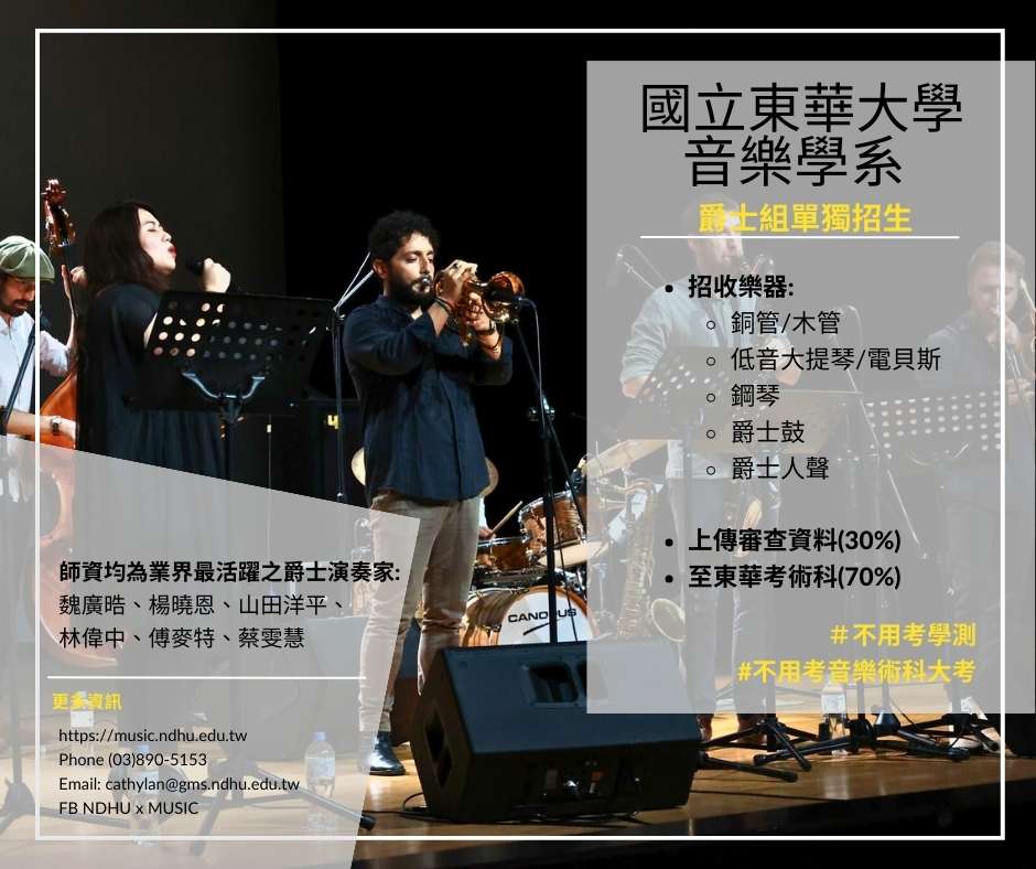 一、爵士組單獨招生,免考學測與音樂術科大考: (一)招生簡章:https://music.ndhu.edu.tw/p/404-1072-205207.php?Lang=zh-tw 二、申請入學乙組,免考音樂術科大考 (一)招生簡章:https://music.ndhu.edu.tw/p/404-1072-205205.php?Lang=zh-tw