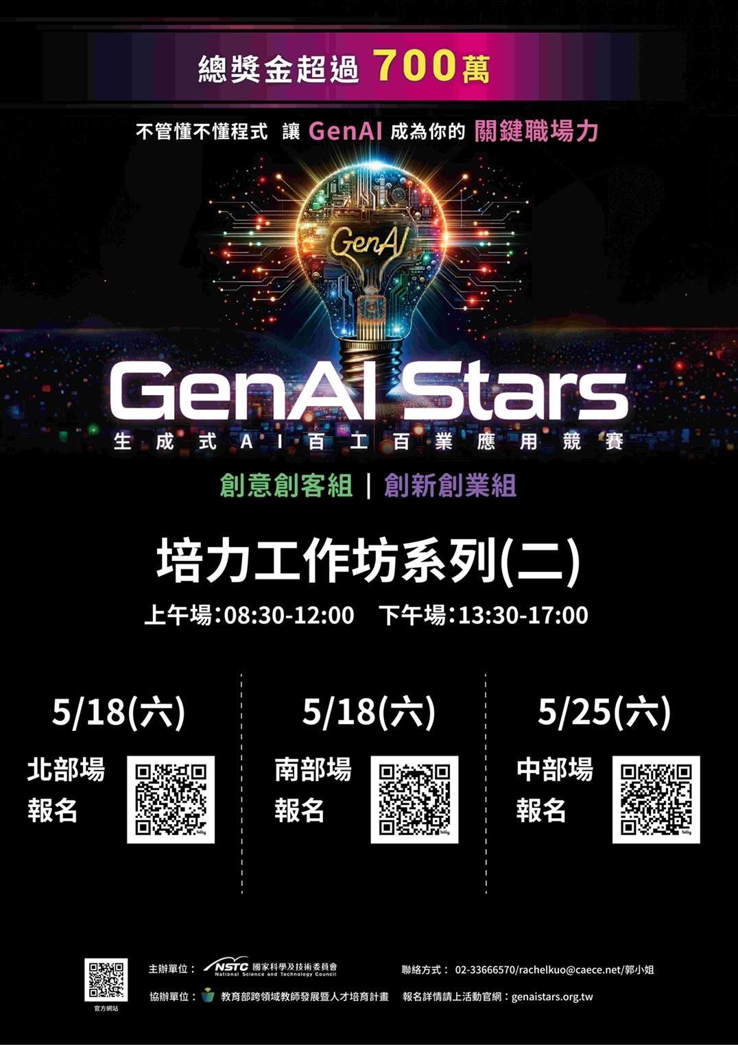 主旨:「教育部跨領域教師發展暨人才培育計畫」與「2024GenAi Stars生成式AI百工百業應用選拔」合作,將於113年5月至6月於北、中、南部辦理培力工作坊,敬請貴校協助轉知所屬高中職師生訊息,請查照。