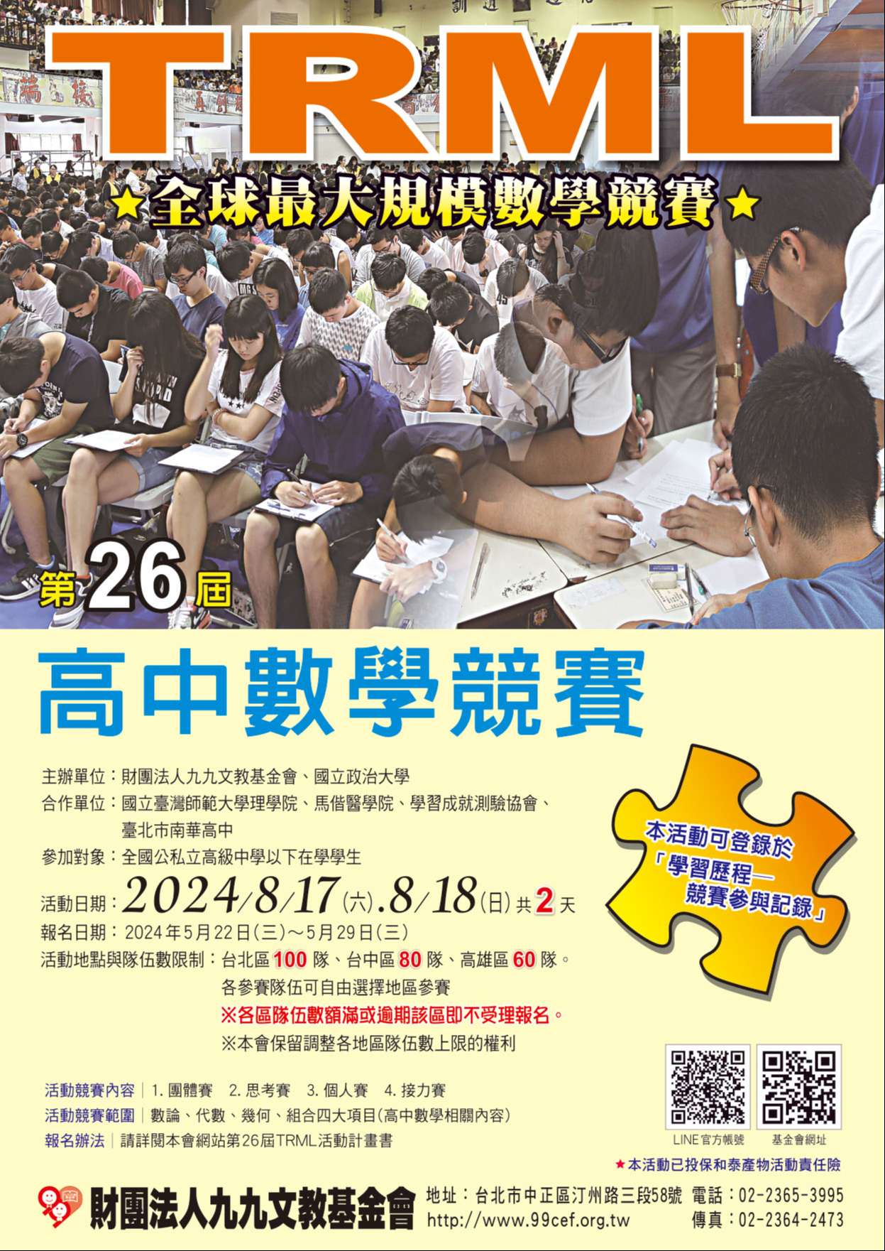 五、活動地點:將於台北、台中、高雄三區舉行,各參賽隊伍 可自由選擇參賽地點,惟參賽地點選定後,恕不接受更 改。另因場地限制,各地區參賽隊伍數額滿後,TRML線上 報名系統該區即不再受理報名,但本會保留調整各地區隊 伍數上限的權限,敬請有意參賽之同學,儘快完成報名手 續。