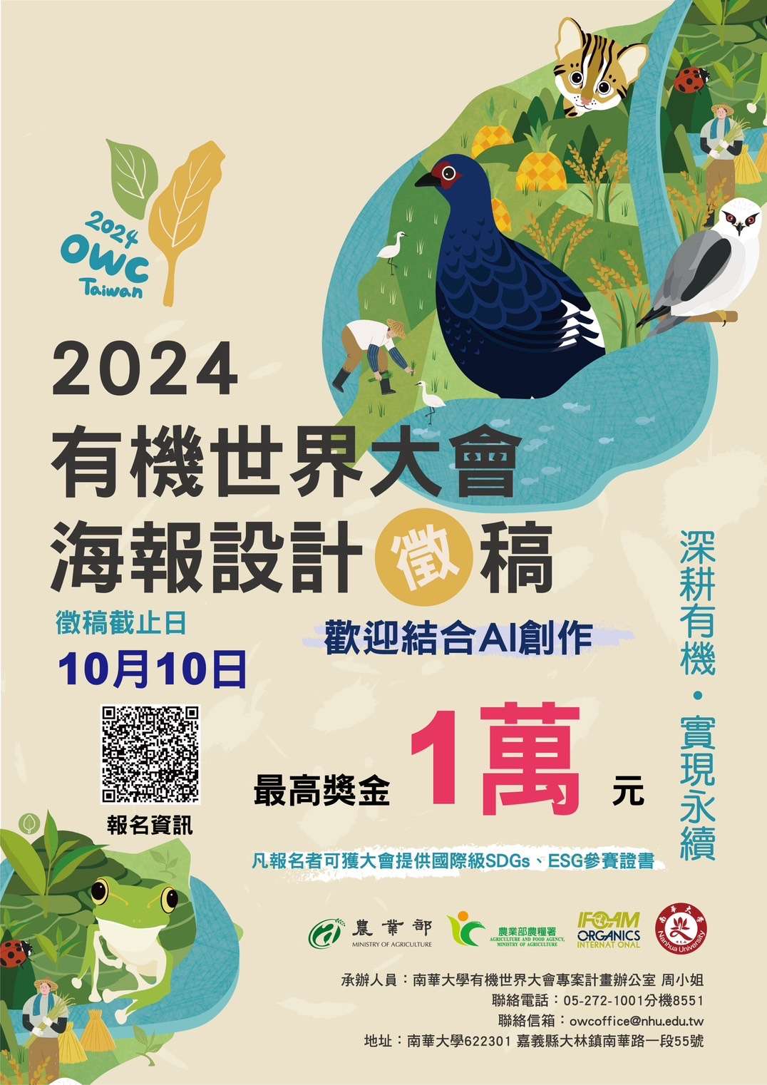 一、第21屆世界有機大會(Organic World Congress, OWC), 由國際有機農業運動聯盟(IFOAM)主辦,此大會每三年舉 行一次。今(113)年將於11月30日至12月4日在嘉義南華大 學盛大舉辦。