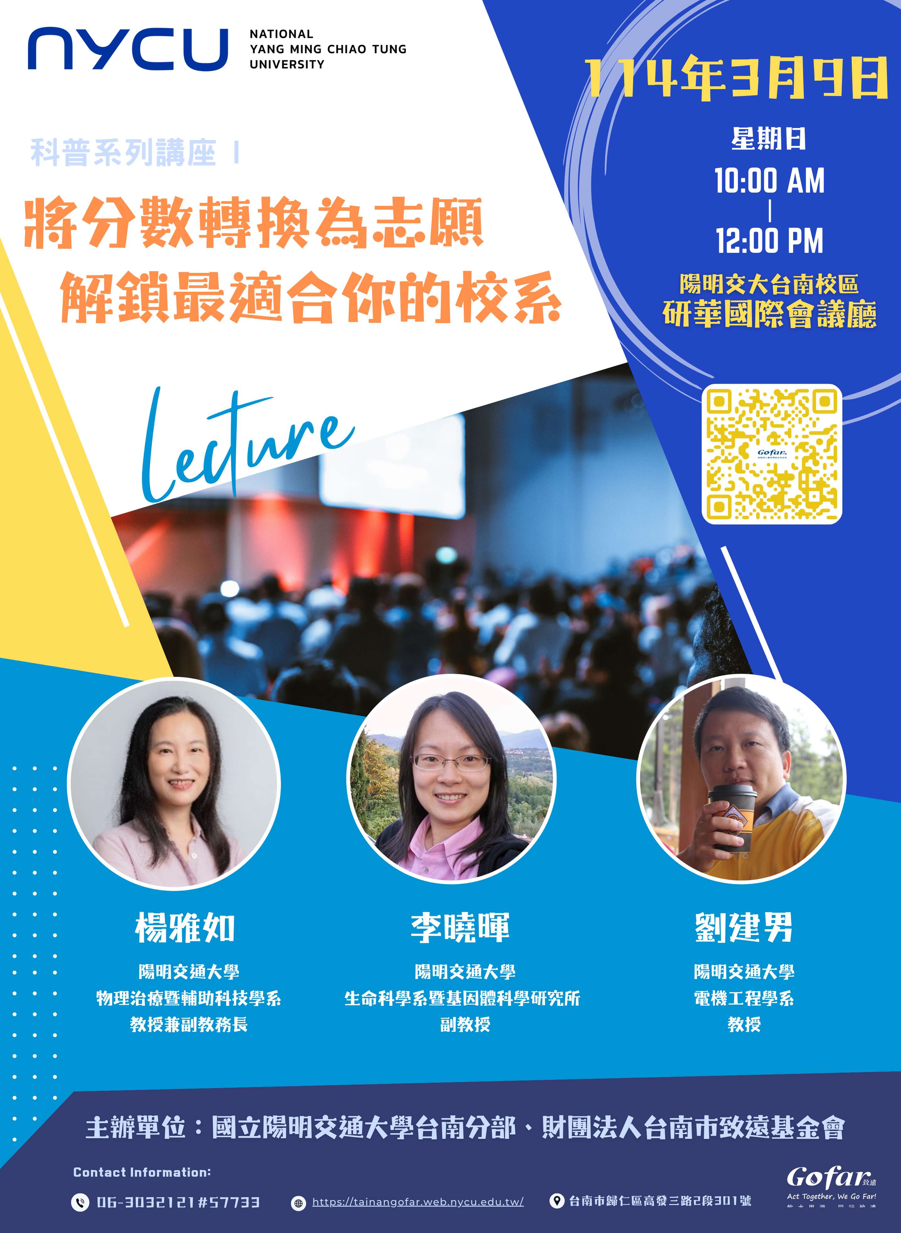 六、檢附講座活動海報供參。詳細科普系列活動請至活動網站https://tainangofar.web.nycu.edu.tw/查詢、報名,或洽活動聯絡窗口:劉小姐(06)3032121分機57733。
