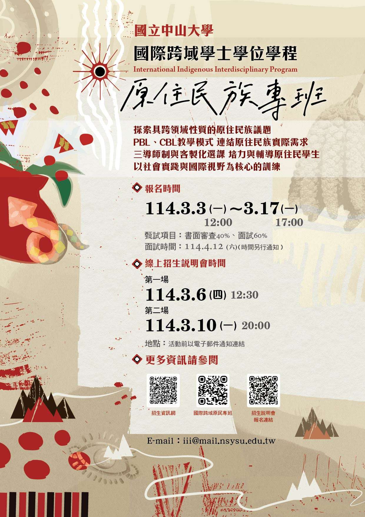 三、招生簡章請詳參本校網站「招生資訊/學士班/國際跨域學士學位學程原住民族專班」(網頁連結:https://reurl.cc /Y4xVVX)。