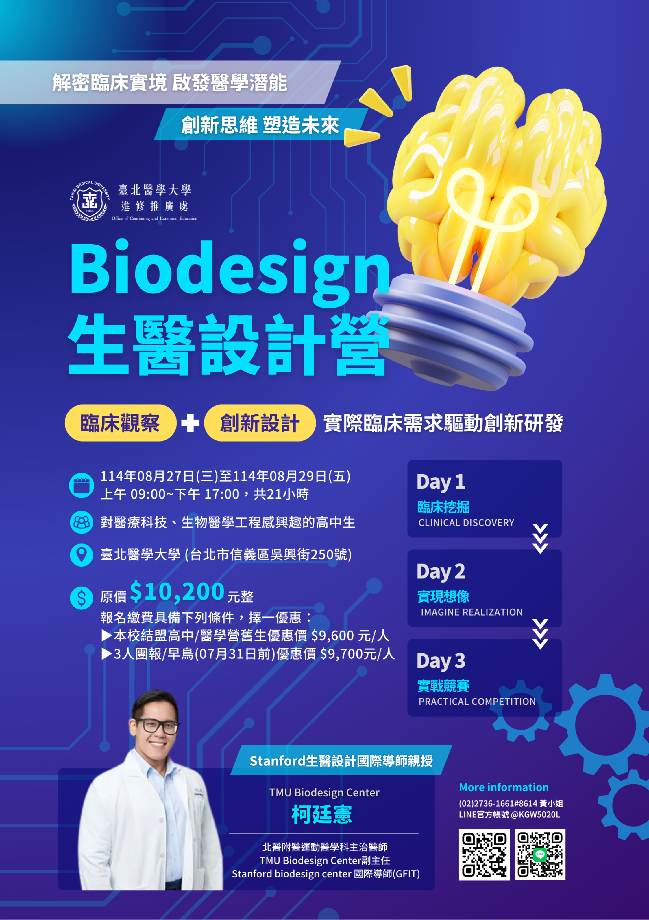 一、為啟發高中生對醫療科技與生醫工程領域之興趣,臺北醫 學大學進修推廣處舉辦「Biodesign 生醫設計營」,結合 臨床觀察與創新設計,透過實際臨床需求驅動學生進行創 新發想與實作競賽。