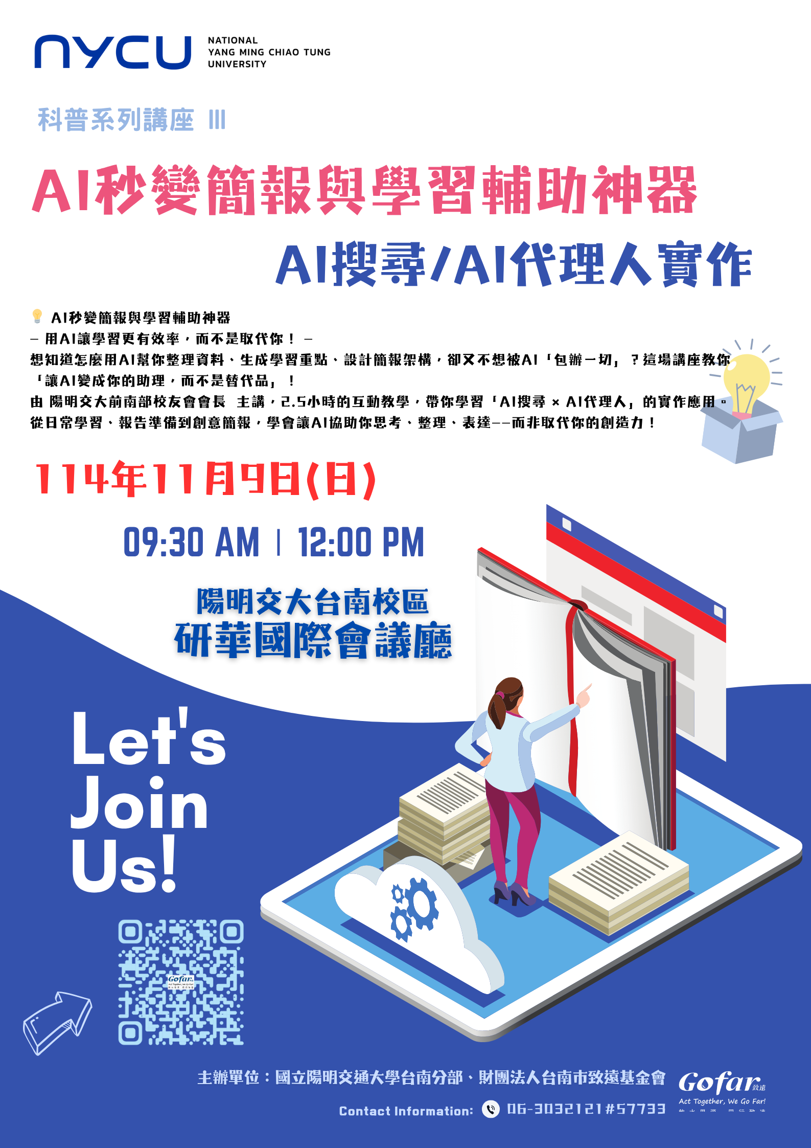 六、檢附講座活動海報供參。詳細科普系列活動請至活動網站 https://tainangofar.web.nycu.edu.tw/查詢、報名,或 洽活動聯絡窗口:劉小姐(06)3032121分機57733。