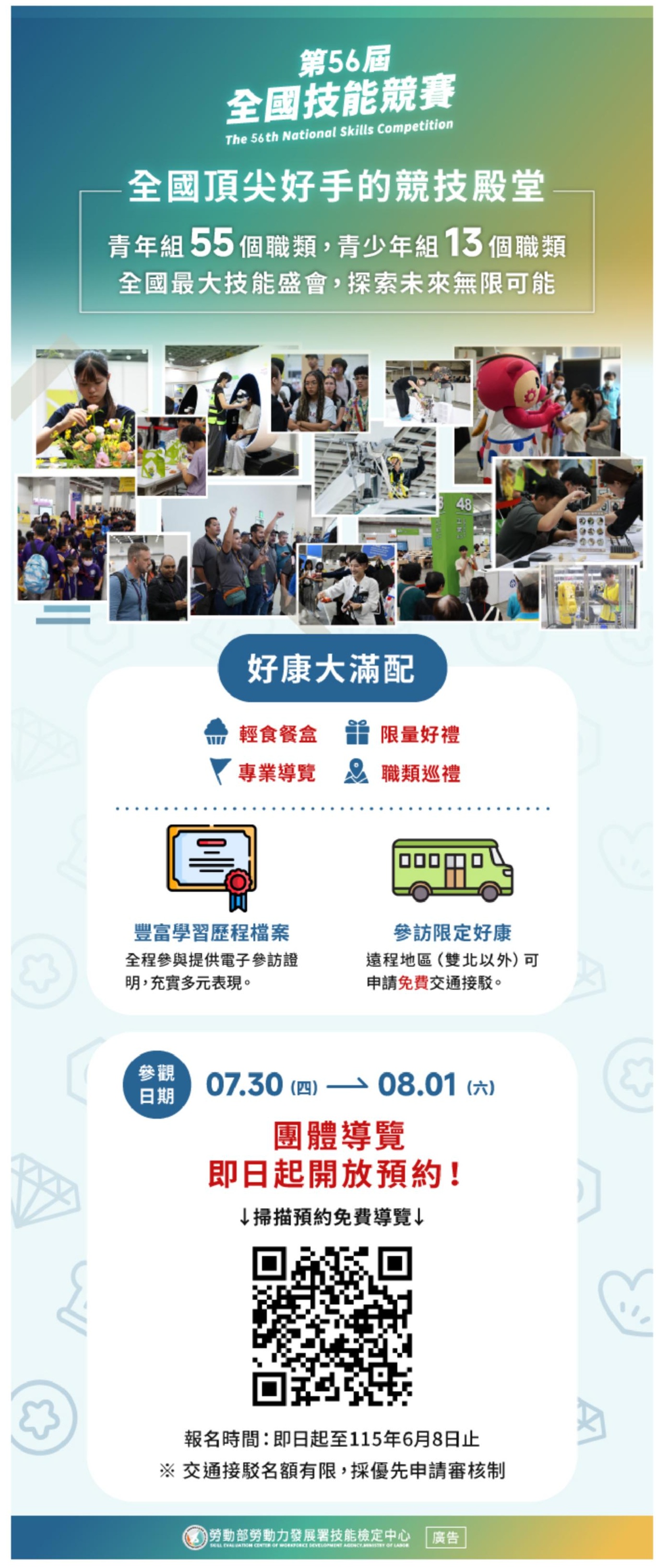 三、旨揭競賽活動之競賽日程(7月30日至8月1日)歡迎各級學 校師生踴躍參訪,安排學生戶外教學,師生一同蒞臨參 觀,現場提供免費導覽(含外語)服務(申請網址: https://reurl.cc/jmj56p)、交通接駁及活動限量宣導 品,期能強化技能教育、提升學習意識,以達到向下紮根 之目的,並強化國際連結。