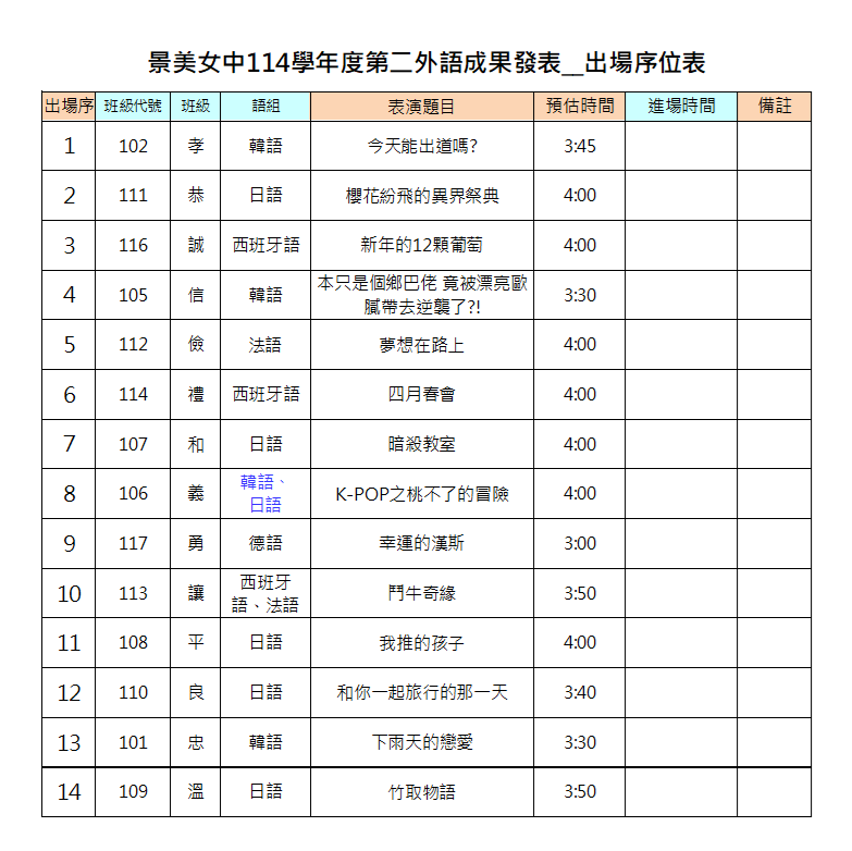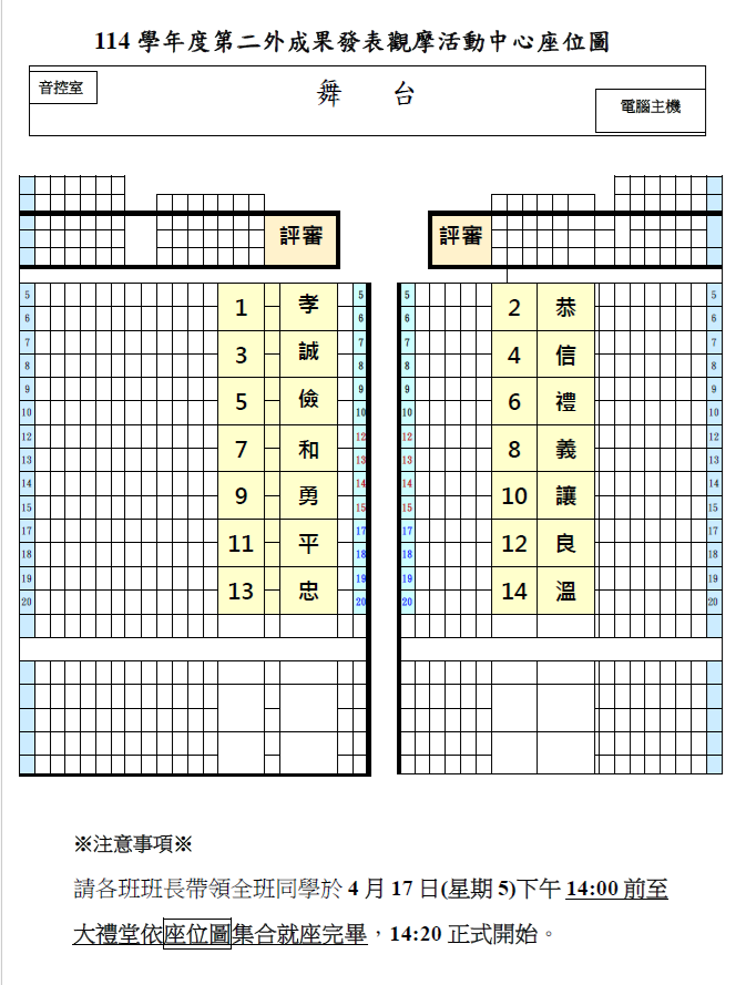 (公告)本校114學年度第二外語成果發表-出場序位表(座位圖)及注意事項