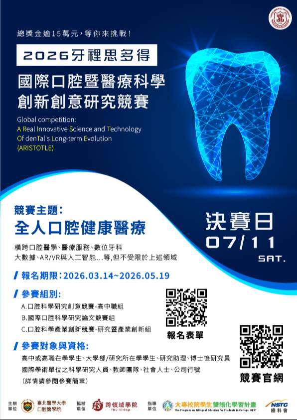 主旨:檢送本校辦理「2026牙裡思多得國際口腔暨醫療科學創新 創意研究競賽」競賽海報及辦法,敬請惠予公告宣傳周 知,並鼓勵師生報名參加,請查照。